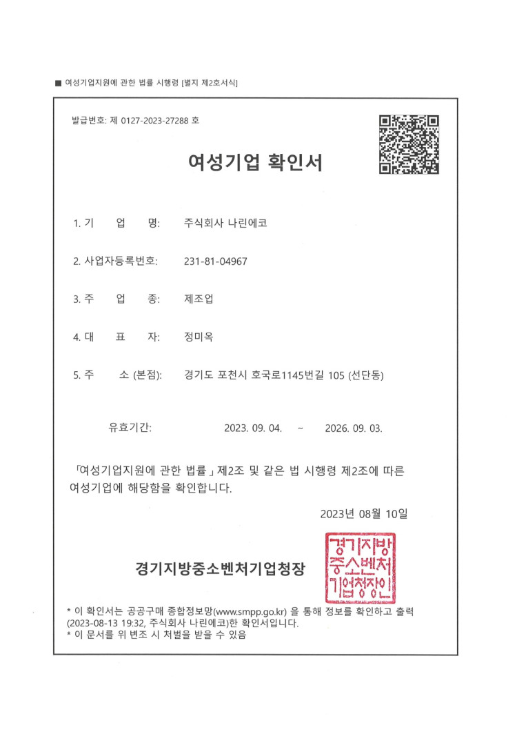 나린에코 | 여성기업 확인서